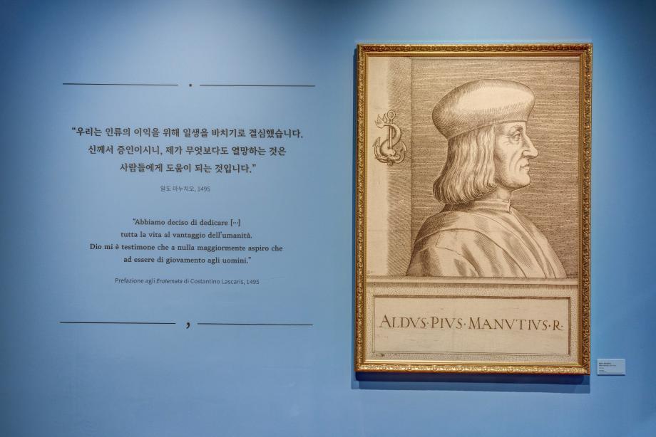 * 알도 마누치오(Aldo Manuzio)는 알두스 마누티우스(Aldus Manutius)라는 라틴어 이름으로도 알려져 있으나 이 전시에서는 이탈리아어 이름인 알도 마누치오로 표기합니다.